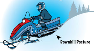 Once you begin your descent get yourself in a seated position and shift your weight toward the back of the snowmobile. As you start downhill, feather the throttle to keep the drive belt engaged and let gravity do most of the work. To maintain control apply the brake intermittently and gradually throughout the descent. Be sure not to brake too hard as this could cause you to slide or lose control.