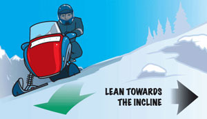 If you lose control of your snowmobile while crossing, climbing or descending a hill and it begins to roll you should jump off immediately on the uphill side. This will ensure the snowmobile doesn’t roll over top of you.